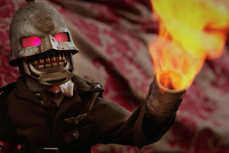 So what’s the story this time around? In a twist on Charles Band’s Puppet Master franchise mythology, The Littlest Reich turns infamous “Geppetto of the Dead” André Toulon ( into a practising Nazi. He has fled *back* to Germany during Hitler’s WWII rise, unleashing his wooden minions as a lethal death squad. It’s a departure, and one that instills an unsavory air of resentment throughout every LGBT, Jewish, or racially-insensitive casualty because for Toulon – a man whose mansion is still a war memorial filled with Swastika flags and German propaganda – the “cause” never really died. It’s a motif that’s perfectly displayed by The Littlest Reich’s opening “accident” when a female bartender is decapitated for nothing more than being in a same-sex romance.